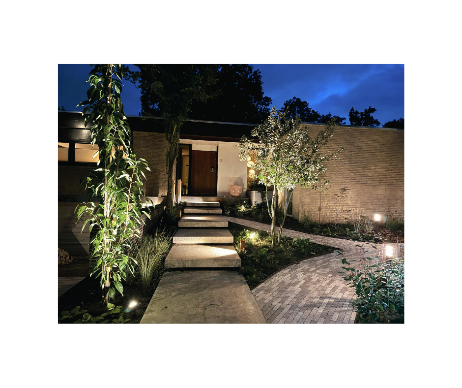 De grondspots accentueren de bomen en geven diepte aan de tuin.