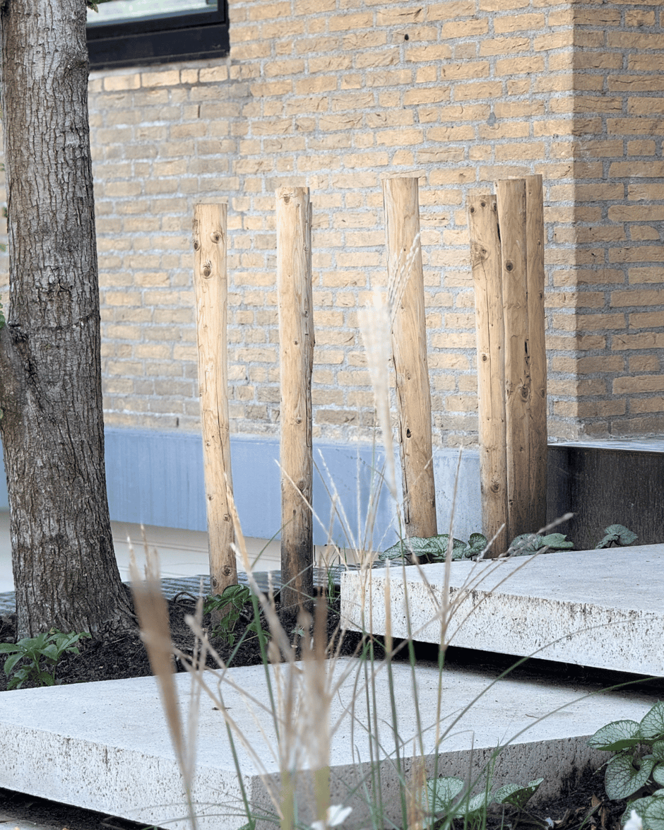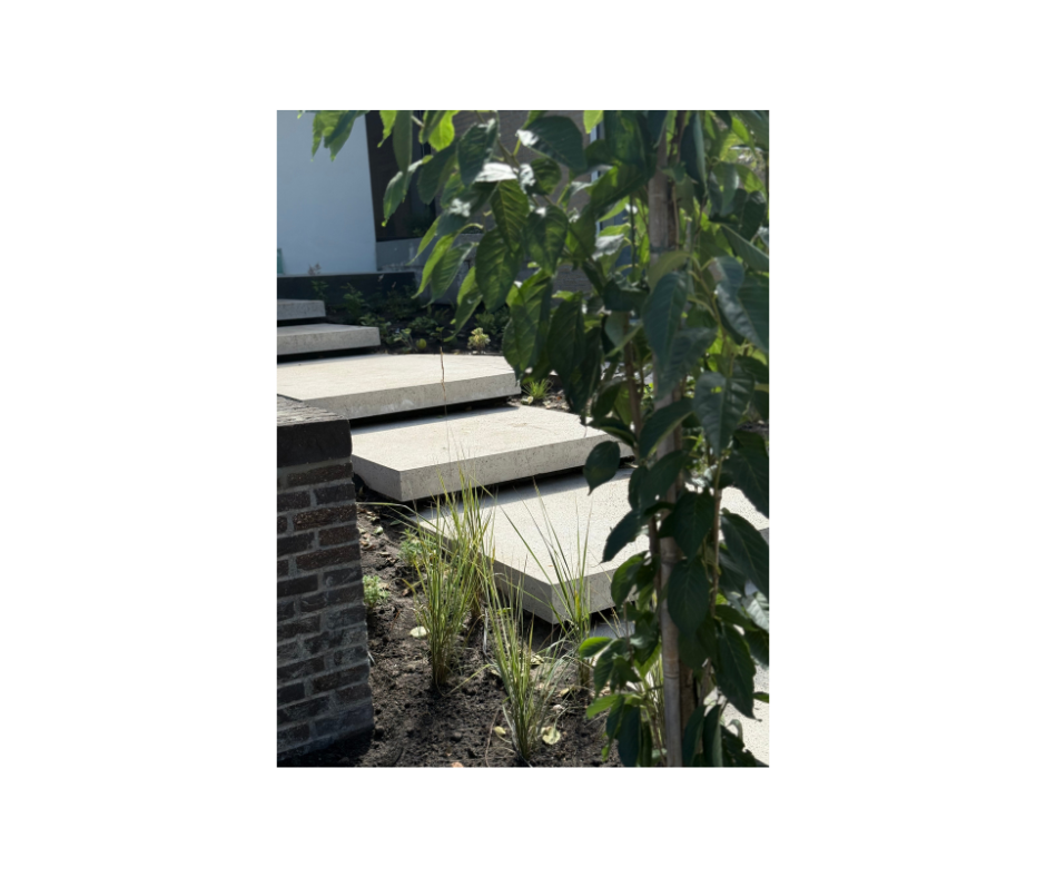 Het ritme van drie treden omhoog gevolgd door een lang formaat vlak zorgt voor een mooie balans tussen rust en dynamiek. Precies passend bij de architectuur en stijl van deze jaren 60-villa.