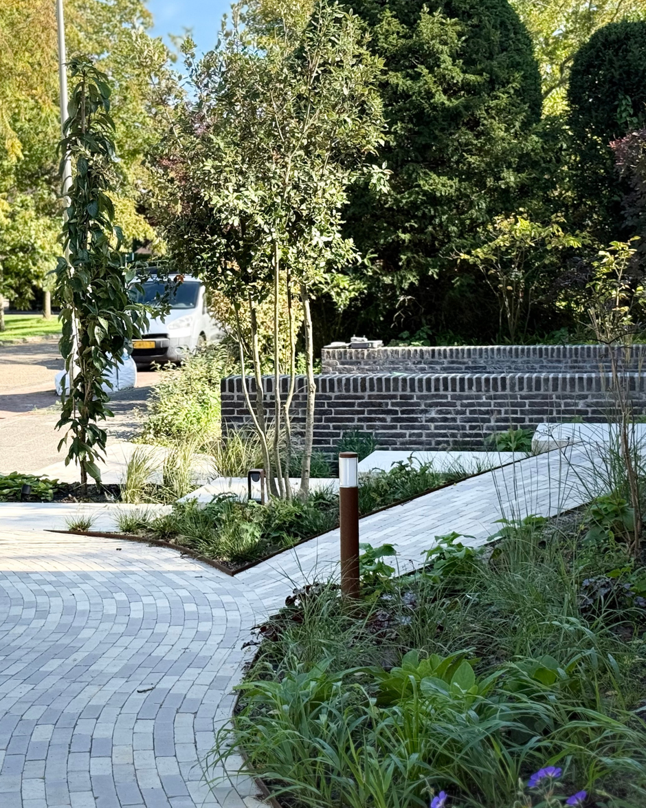 Richting de fietsenoverkapping zorgen lage lichtpaaltjes tussen de beplanting voor subtiele oriëntatie en een veilige route